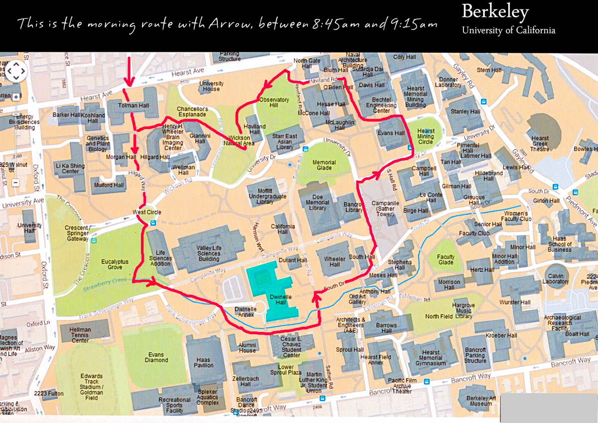 This work is the most interesting for me. I have the privilege to go around the Campus twice a day, five days a week. It is the most interesting because it combines two things that I enjoy: taking pictures and being with dogs. I started to walk Coco, my neighbor’s chocolate lab, in the spring of 2012. Very quickly I fell in love with the Campus and began to photograph it, while walking Coco in late afternoon. This is not of course about The University of California at Berkeley, but about what I see during these walks on the Campus and only on my route, which leaves some parts completely ignored. There is no planning or preparation involved, just a quick use of the shutter-release button of my pocket camera. I used a Canon A480 until November 2014 when it got wet in my back pocket during a serious storm, yes on the Campus. I have been using a Coolpix S6800 since then. With time, I have learnt how to anticipate as much as possible instead of just watching the action to then realize that I had missed the shot!
